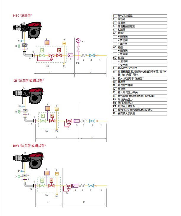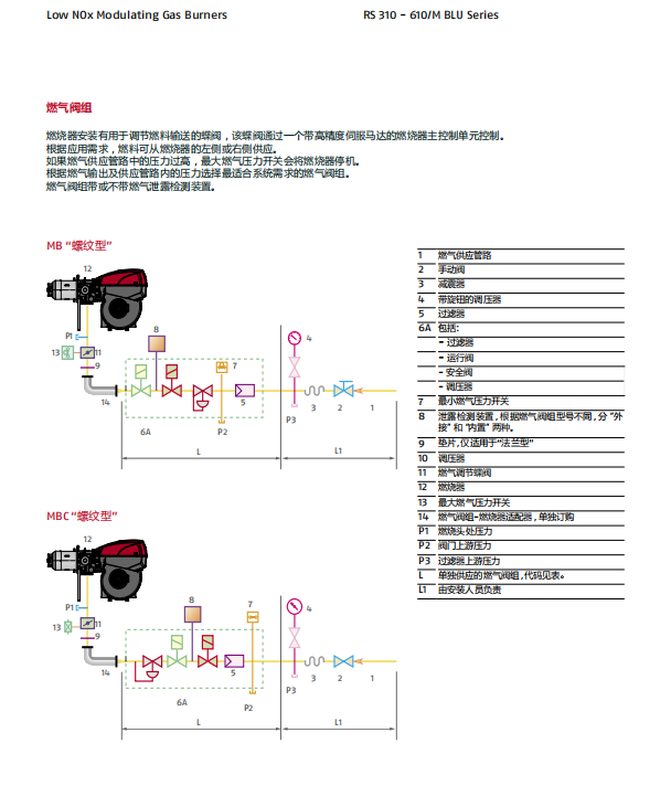 RS BLU 型燃烧器可与 MB 和 VGD 燃气阀组配套使用。根据可用燃气供应和所需阀组类型进行选择。